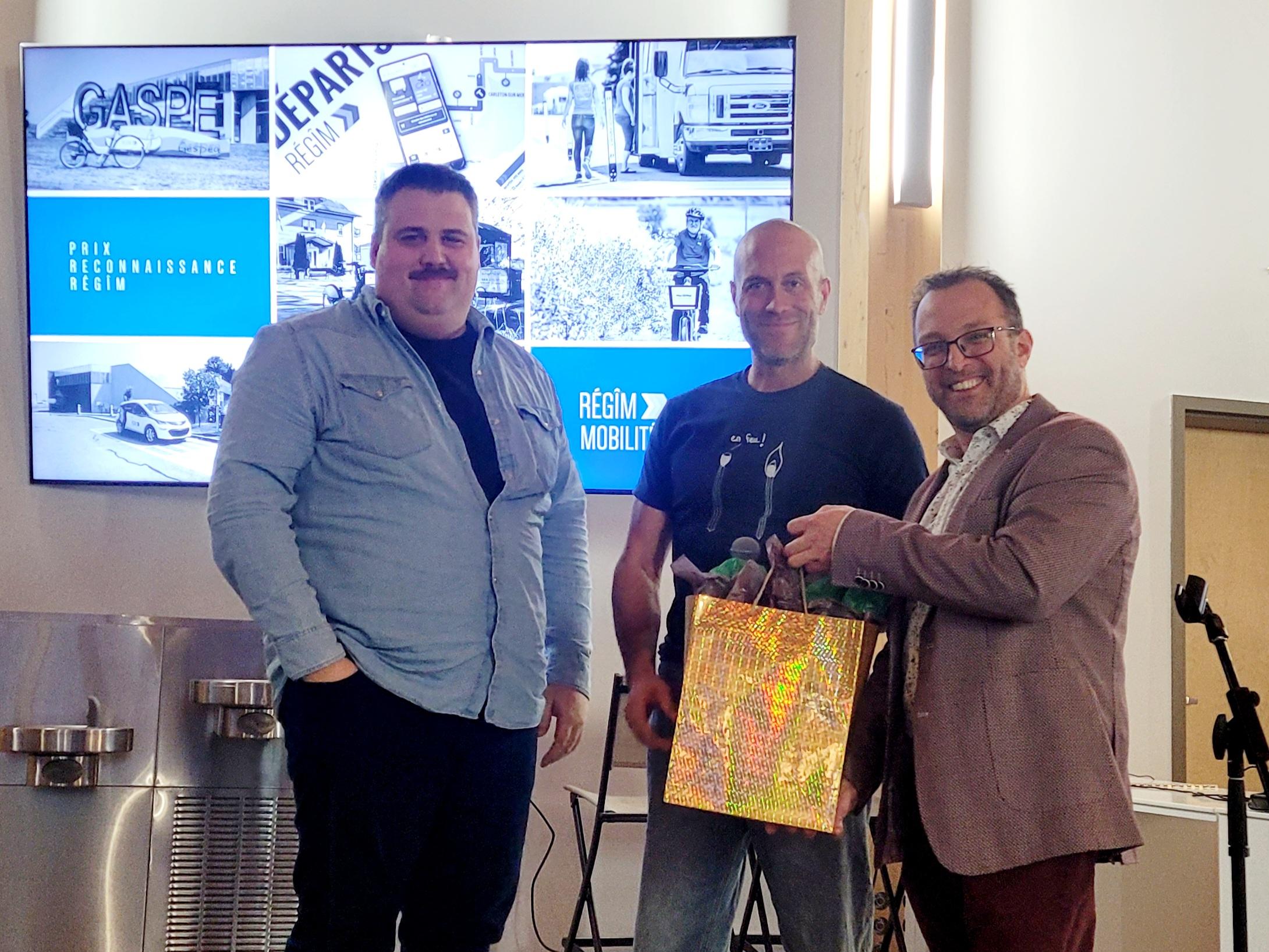 De gauche à droite : Marc-André Noël, Changé de projet à la ville de Chandler : Mobilité active et développement durable, Pierre-Luc Arsenault, conseiller à la ville de Chandler et Daniel Côté, Président de la RÉGÎM et Maire de Gaspé